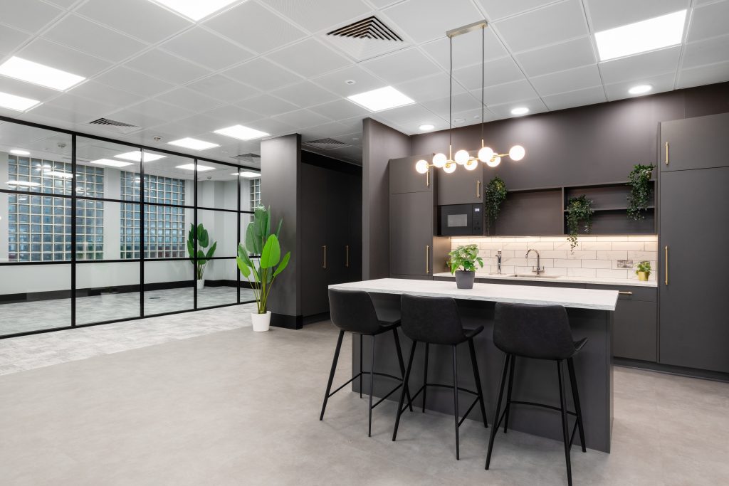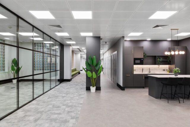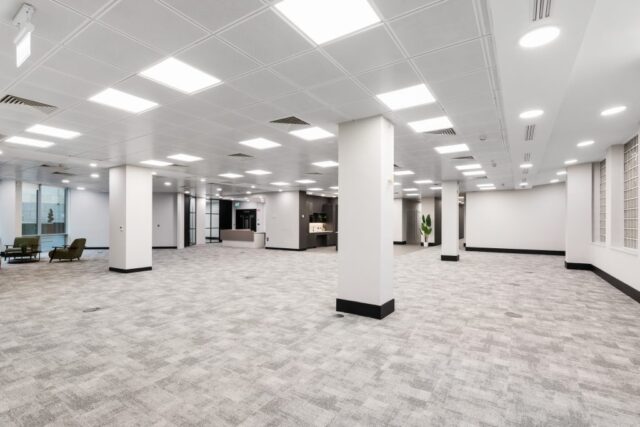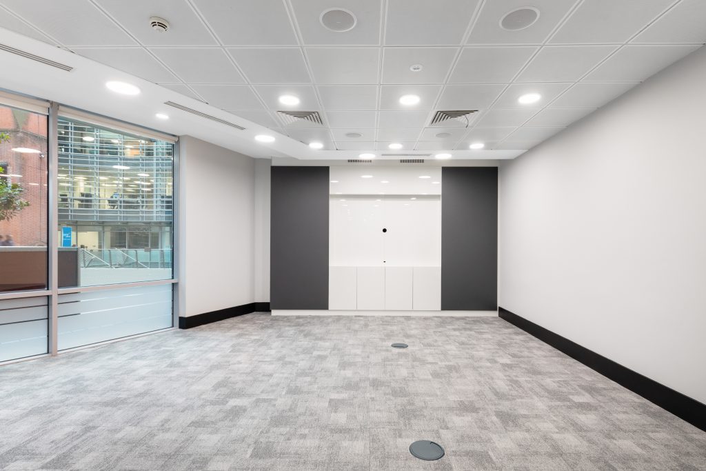 To enhance energy efficiency and light quality, the space was re-lamped with new LED light fittings, providing consistent, modern illumination throughout. The open-plan layout was refined with the installation of full-height double-glazed partitions paired with painted timber doors, offering a premium finish while maintaining visual openness and acoustic privacy.
