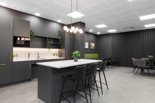 A refreshed amenity zone was created through the installation of new canteen joinery, complemented by durable carpet finishes, bespoke banquette seating, and striking timber fin screens that add warmth and architectural detail. The entire space received full re-decoration, elevating the overall aesthetic and ensuring a cohesive, contemporary look.